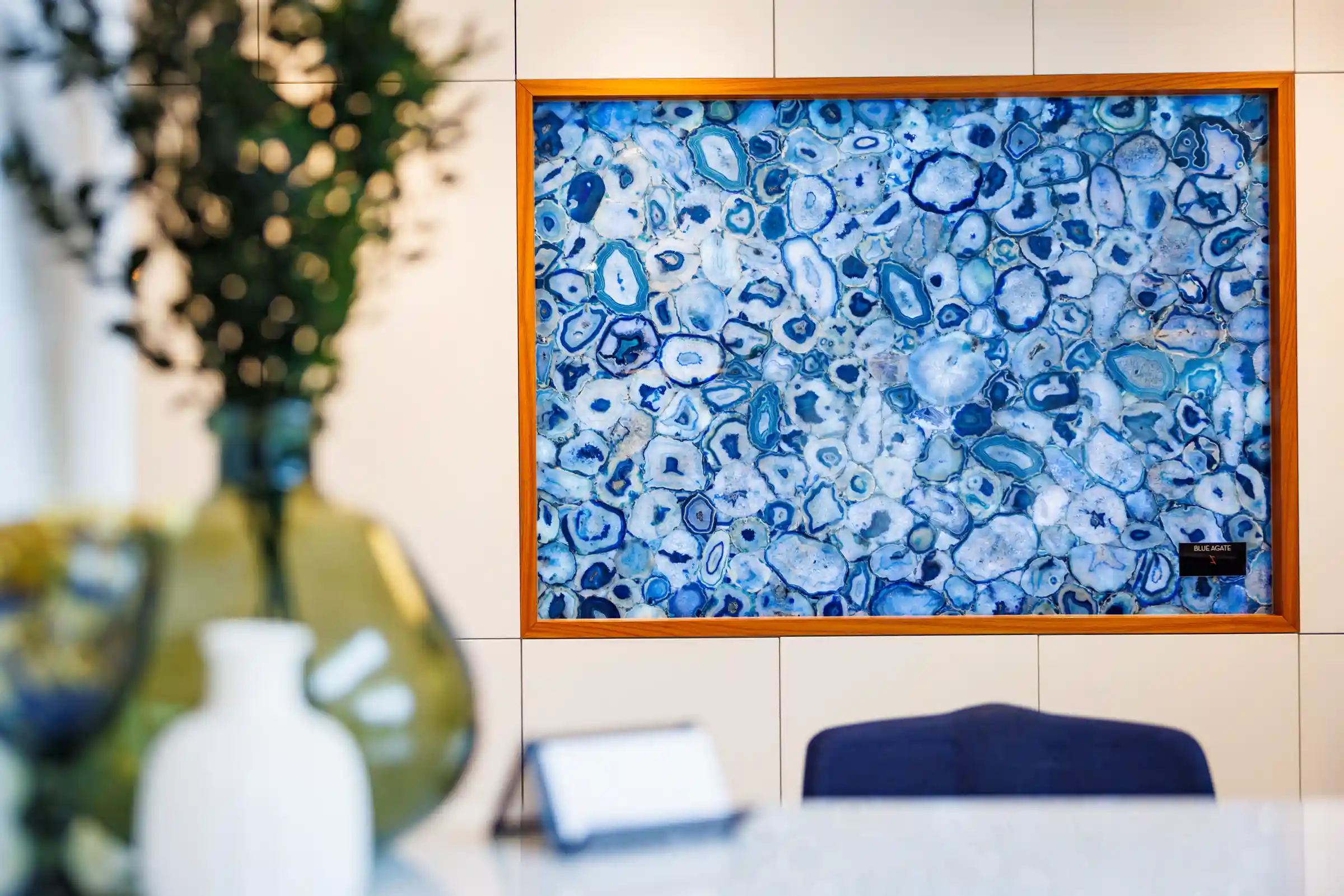 - A Blue Agate féldrágakő táblák finom kék árnyalataikkal és természetes rétegzettségükkel nyugodt, mégis karakteres megjelenést adnak a térnek. Az áttetsző szerkezet lehetővé teszi a háttérvilágítást, amely különleges mélységet és egyedi hangulatot teremt. Ideális választás exkluzív belsőépítészeti megoldásokhoz.