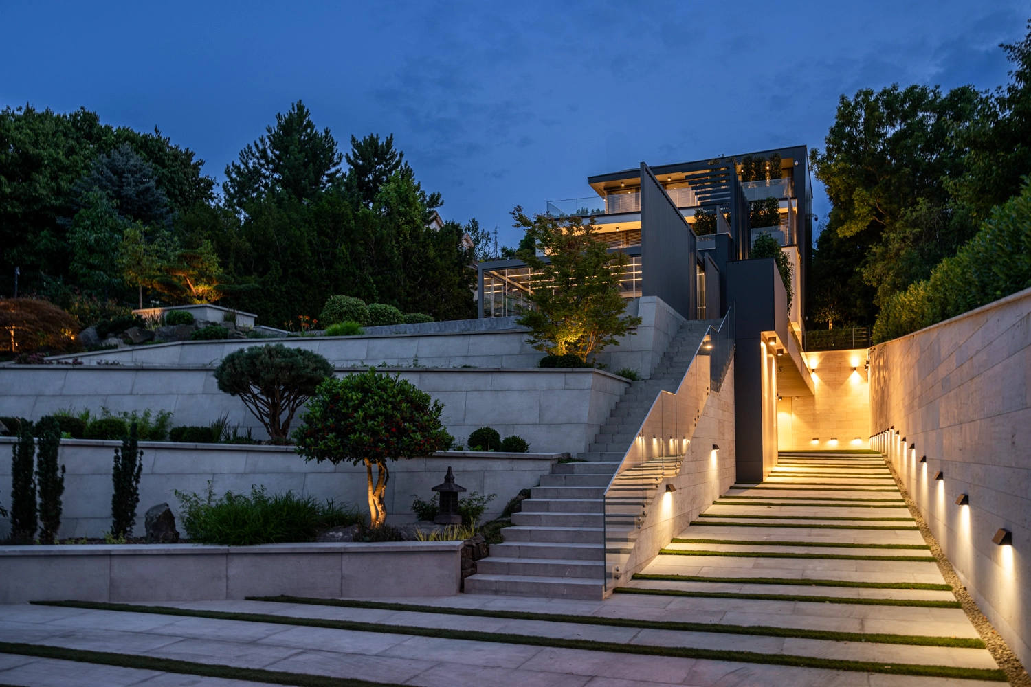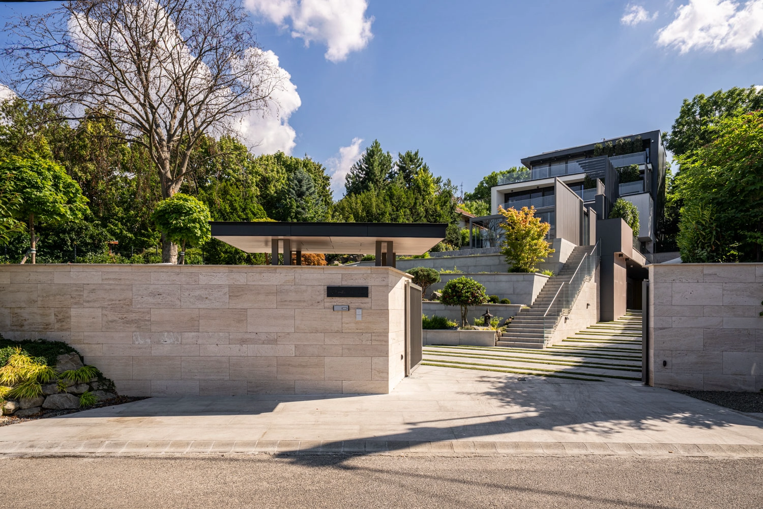 A Csipke utcai exkluzív villa a természetes anyagok és a high-end felületek tökéletes egyensúlyát mutatja. A kültéri terekben alkalmazott Ariostea gresporcelán burkolatok egységes, letisztult megjelenést biztosítanak a teraszon és a kocsibeállón, míg a travertin burkolatú támfalak meleg, organikus karaktert adnak az épületnek.