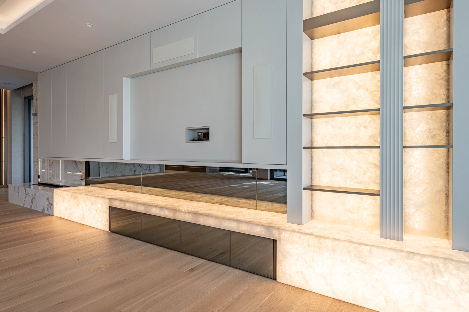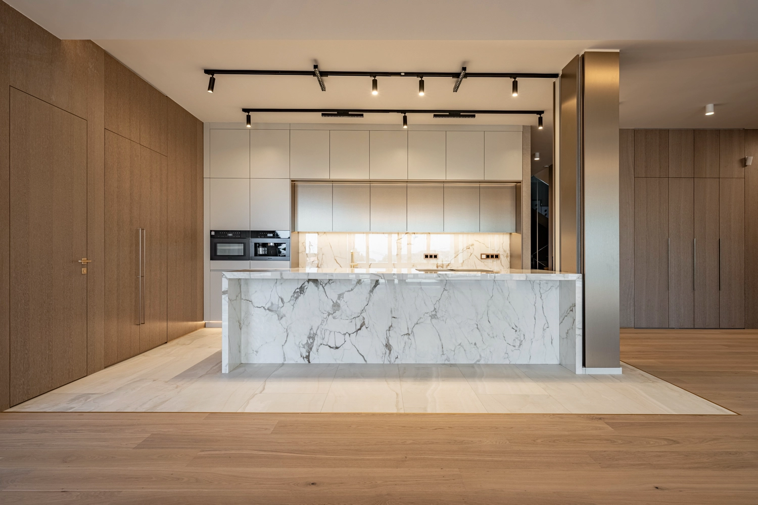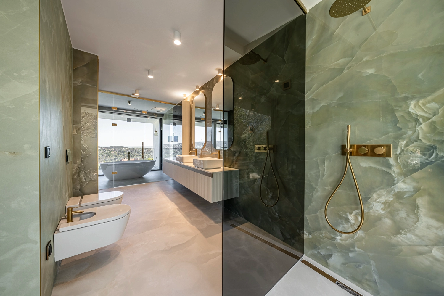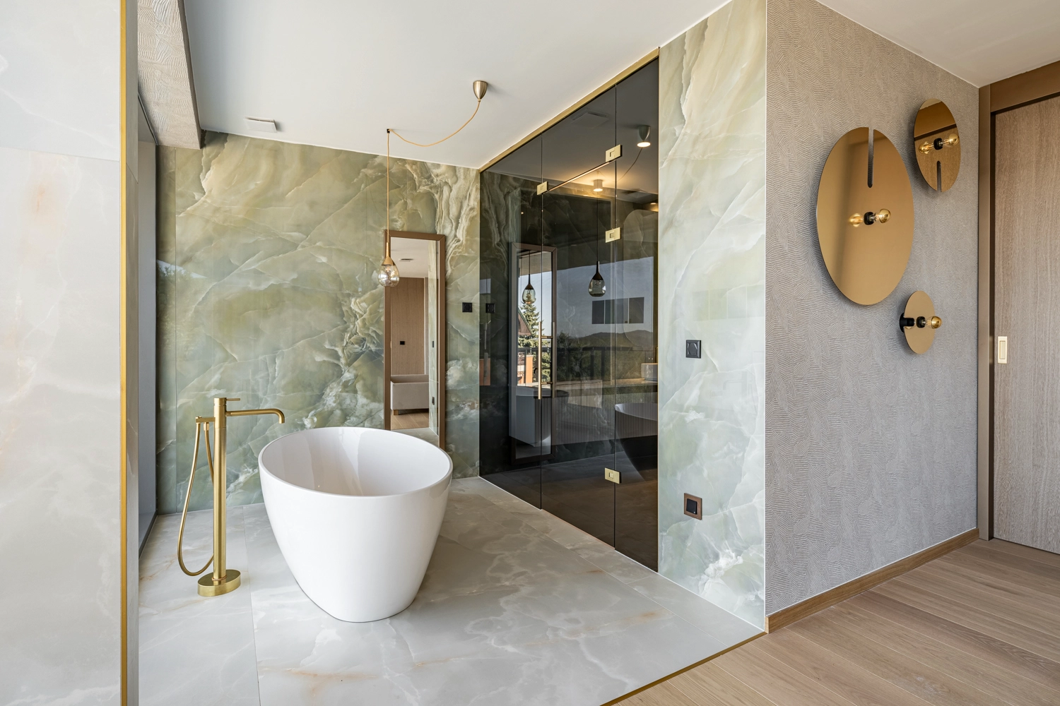 A belső térben a fürdőszobák Ariostea gresporcelán burkolatai időtálló eleganciát képviselnek, a konyhában pedig a SapienStone porcelán munkapultok ötvözik a kifinomult esztétikát a kiemelkedő funkcionalitással. A tér egyik különleges elemei az átvilágítható gemstone táblák, amelyek egyedi fényjátékkal emelik a belsőépítészet színvonalát.