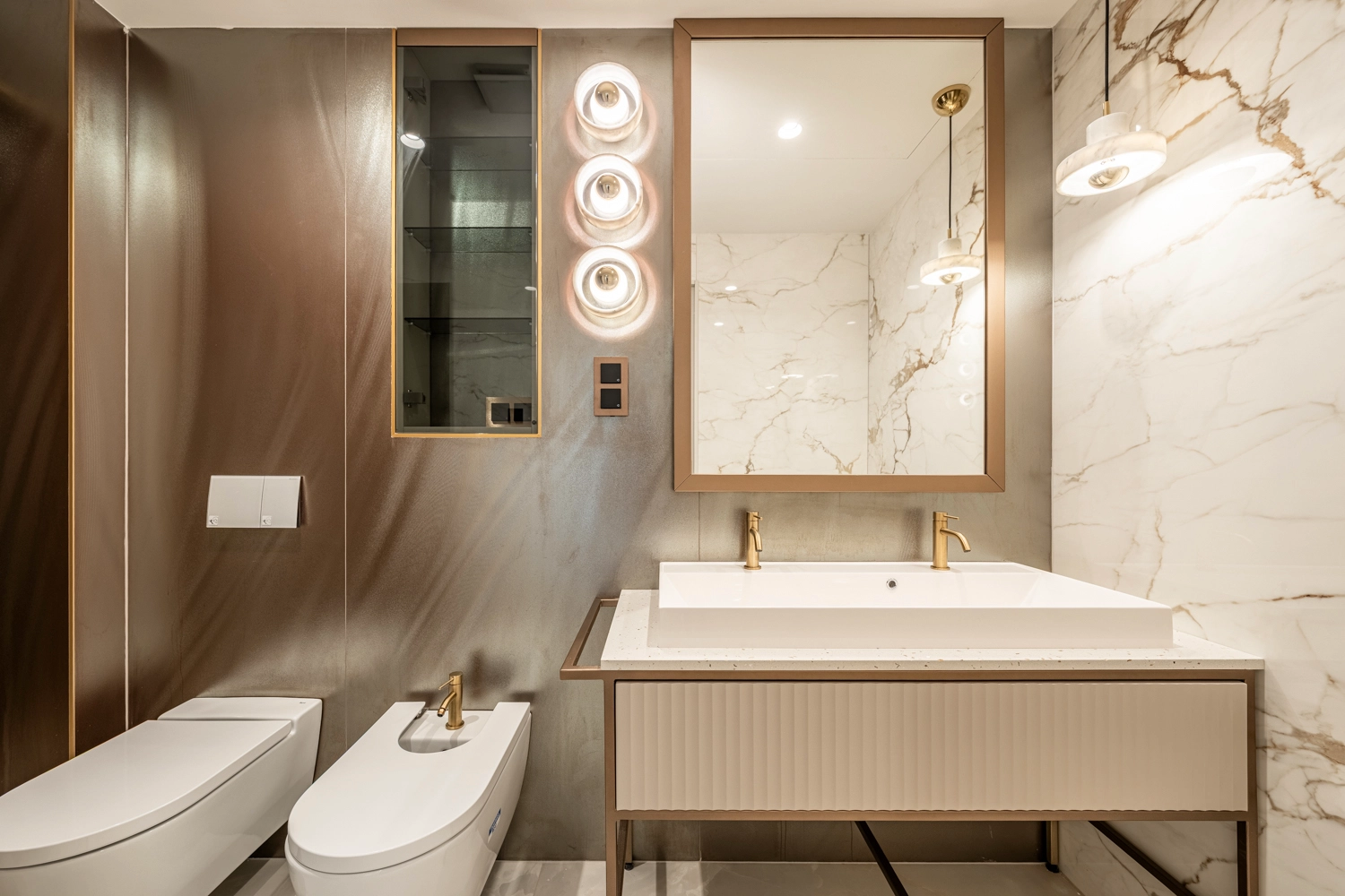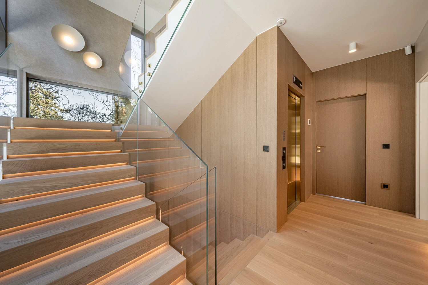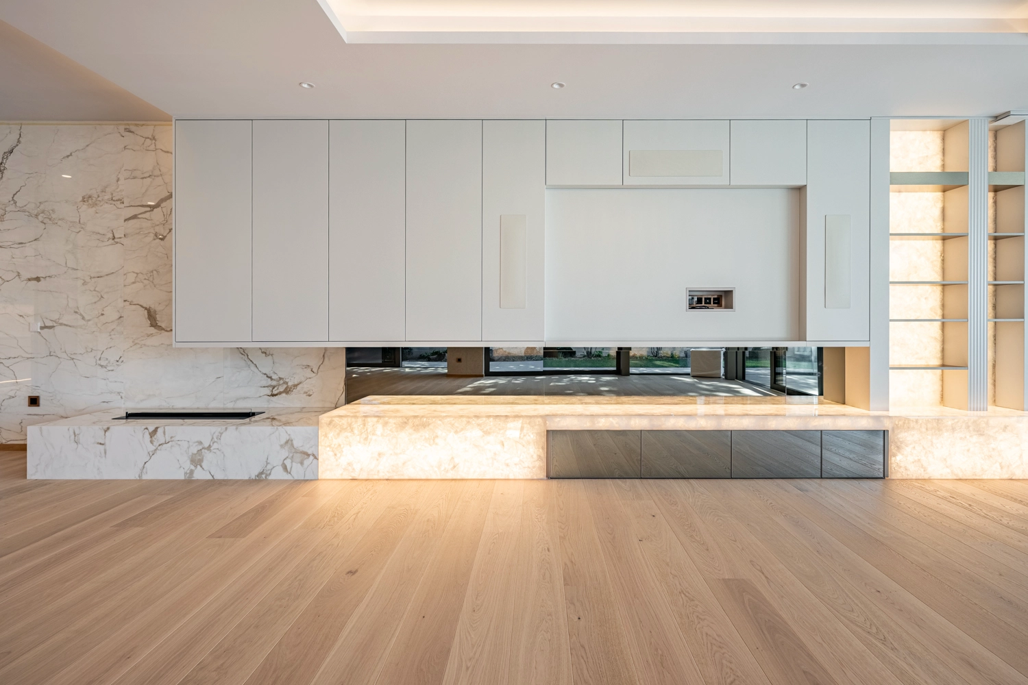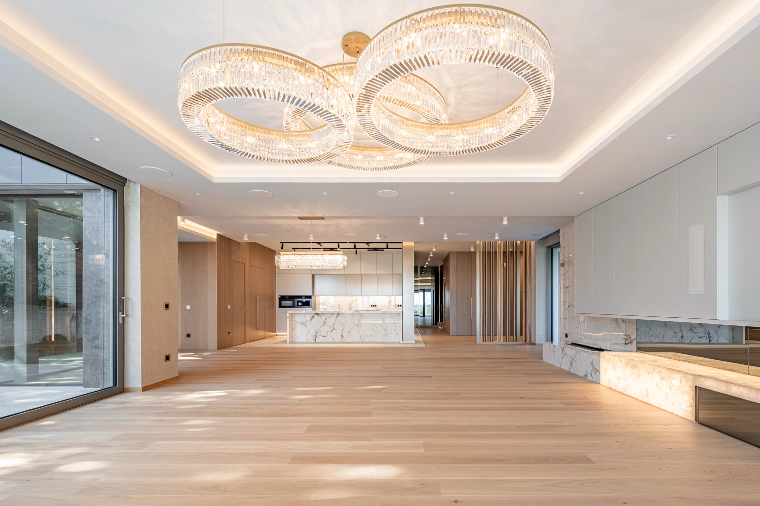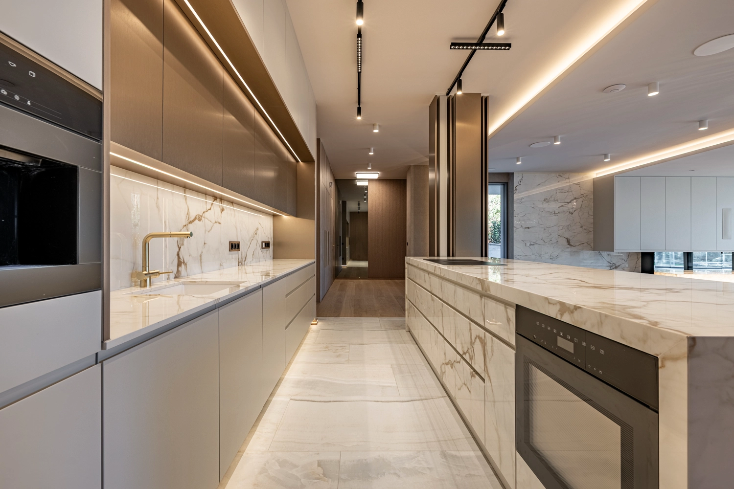 A belső térben a fürdőszobák Ariostea gresporcelán burkolatai időtálló eleganciát képviselnek, a konyhában pedig a SapienStone porcelán munkapultok ötvözik a kifinomult esztétikát a kiemelkedő funkcionalitással. A tér egyik különleges elemei az átvilágítható gemstone táblák, amelyek egyedi fényjátékkal emelik a belsőépítészet színvonalát.