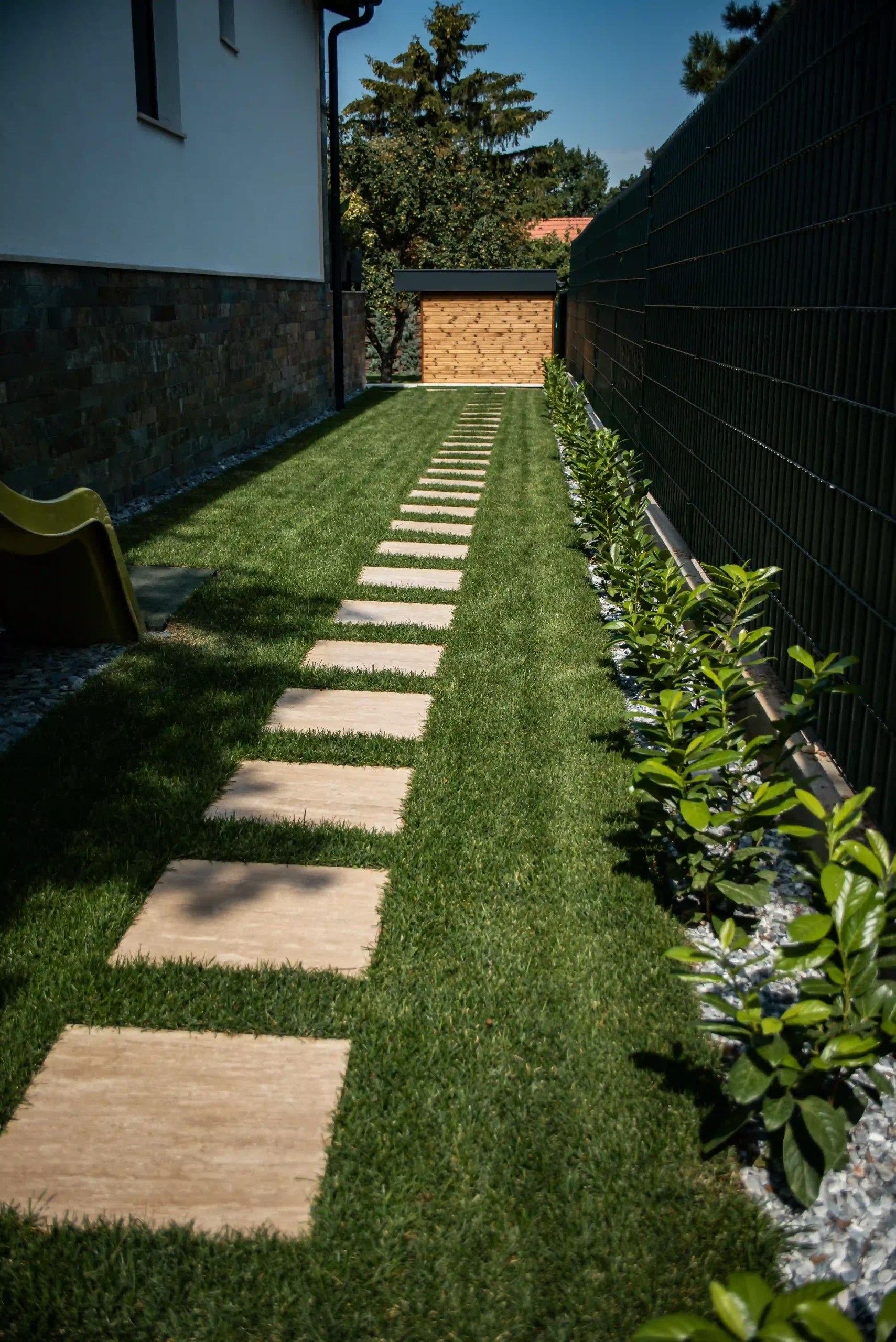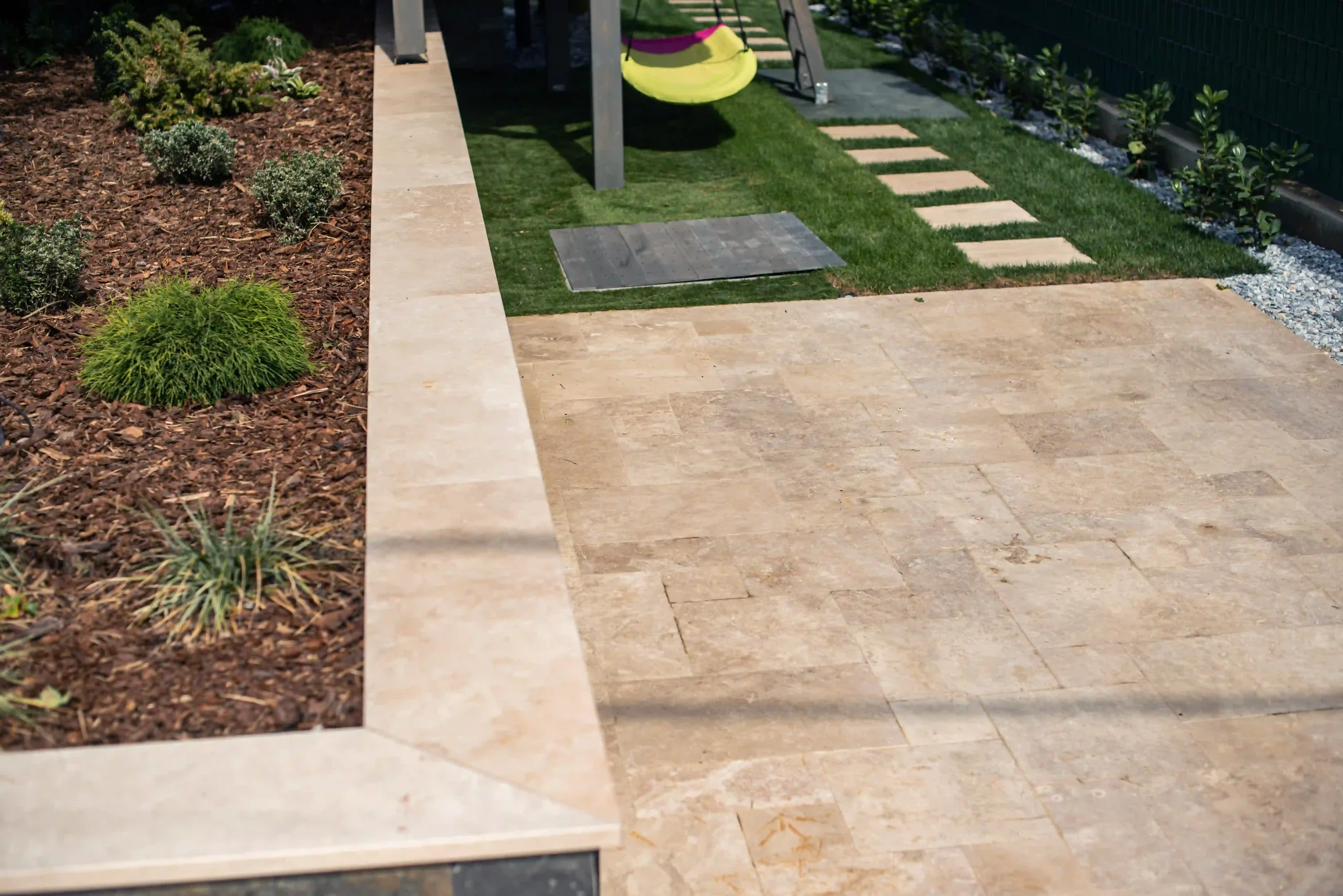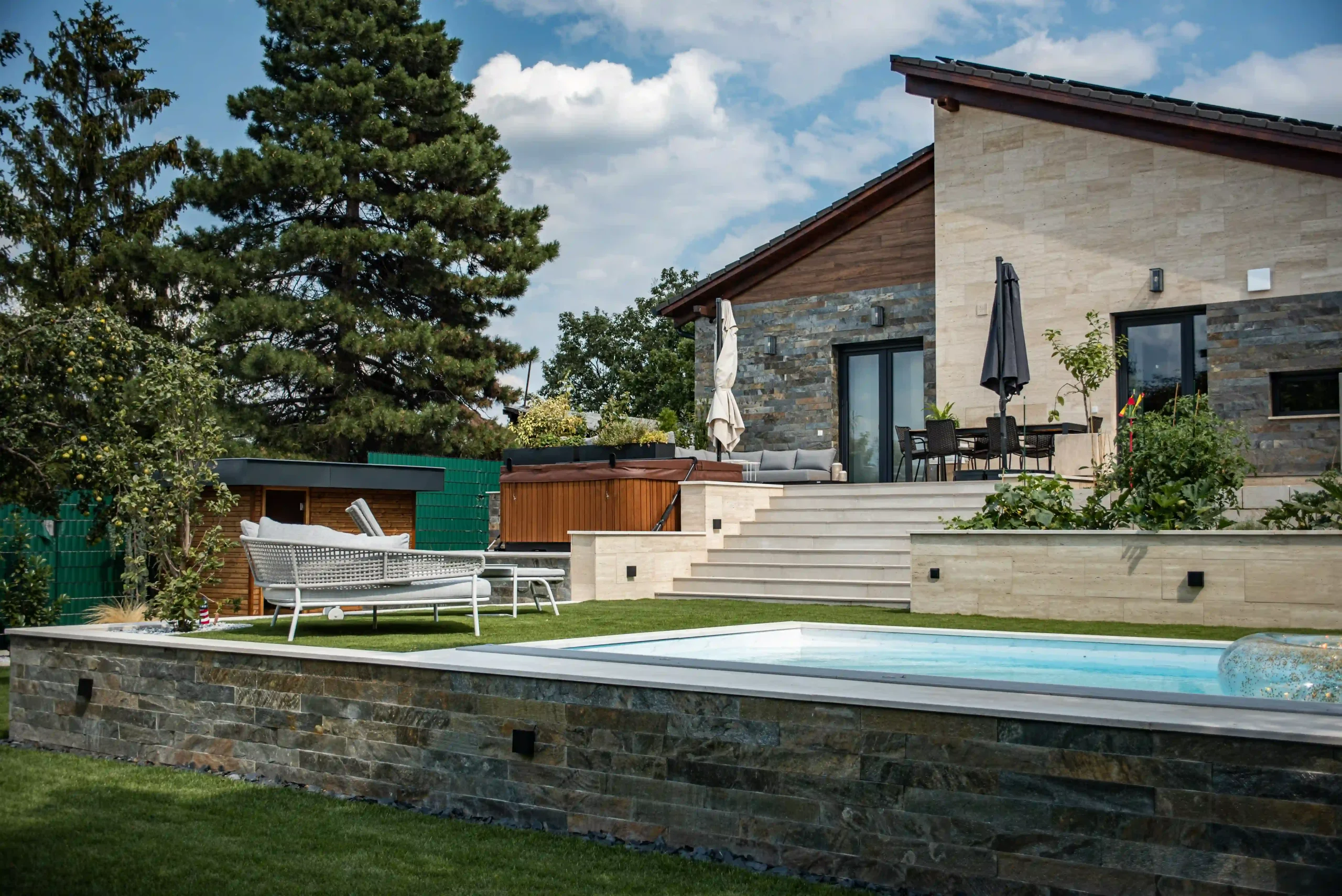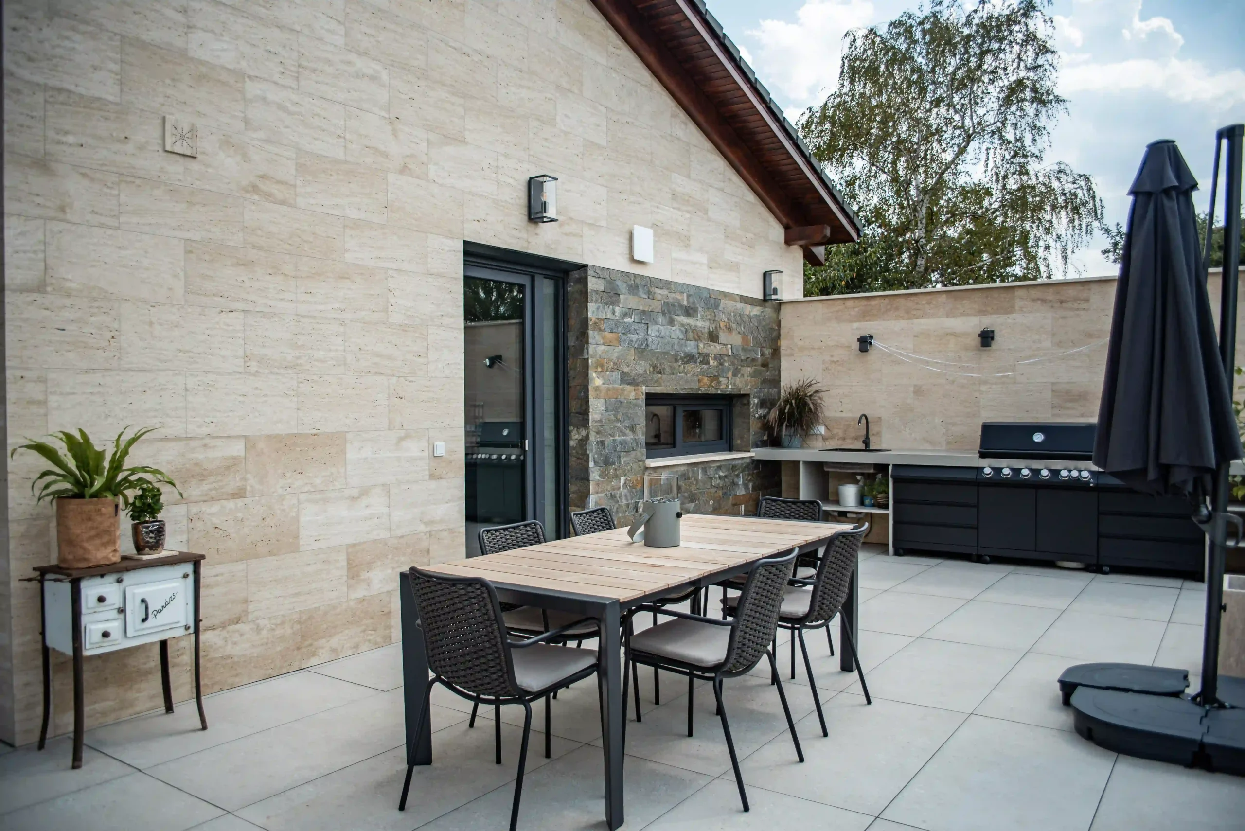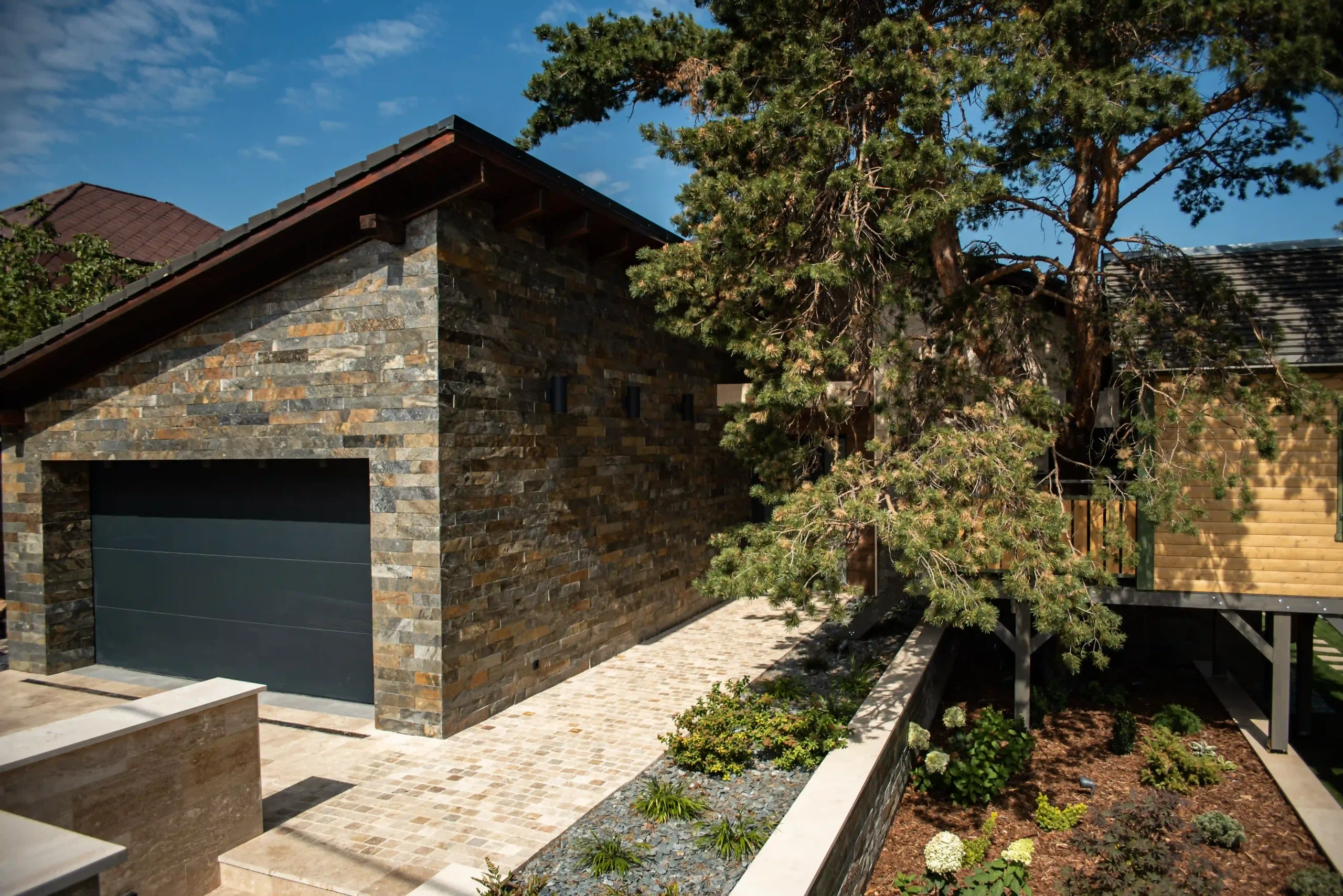 Ez az exkluzív, földszintes családi ház Érden tökéletes harmóniát teremt a modern design és a természetes anyagok között. A homlokzatot a letisztult Light travertin és a karakteres Deoli Green kvarcit díszíti, míg a kocsibehajtókon és járdákon koptatott travertin biztosít időtálló, stílusos megjelenést. A fedlapok szintén travertinből készültek egyedi méretben, elegáns egységet alkotva az épület egészével. Egy otthon, ahol a természetes szépség találkozik a modern építészettel!