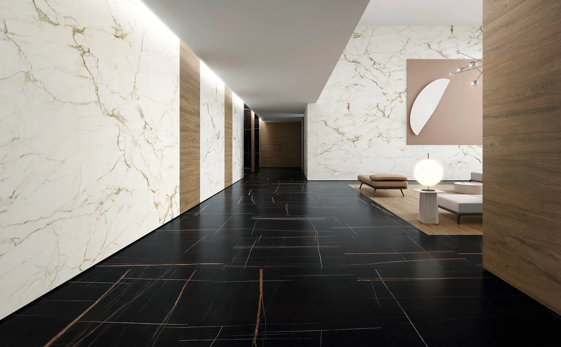 Az Ariostea Ultra Marmi Sahara Noir egy exkluzív burkolat, amely mélyfekete alapszínét kontrasztos arany és fehér erezetekkel ötvözi, elegáns és drámai megjelenést teremtve. Nagy méretű lapjai minimalizálják a fugákat, így letisztult, egységes felületet biztosítanak. Tartóssága és könnyű karbantarthatósága miatt ideális választás prémium belső terekbe.